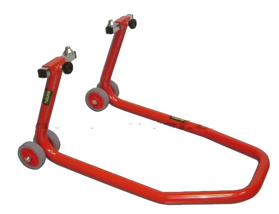 Adatto a tutte le moto che presentano fori sotto e forcelle anteriori. Attacchi a cono registrabili. Tubo in acciaio di grande diametro, verniciato a polvere. Quattro ruote in gomma con anima rinforzata.