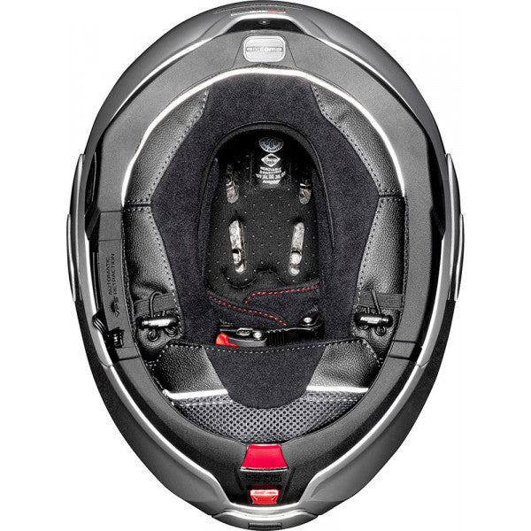 - Sistema di ritenzione con regolazione micrometrica a doppia leva Microlock: il sistema di chiusura 2.0 è brevettato Nolan e si caratterizza per essere ancorato in due punti in modo da risultare più sicuro e più pratico.
